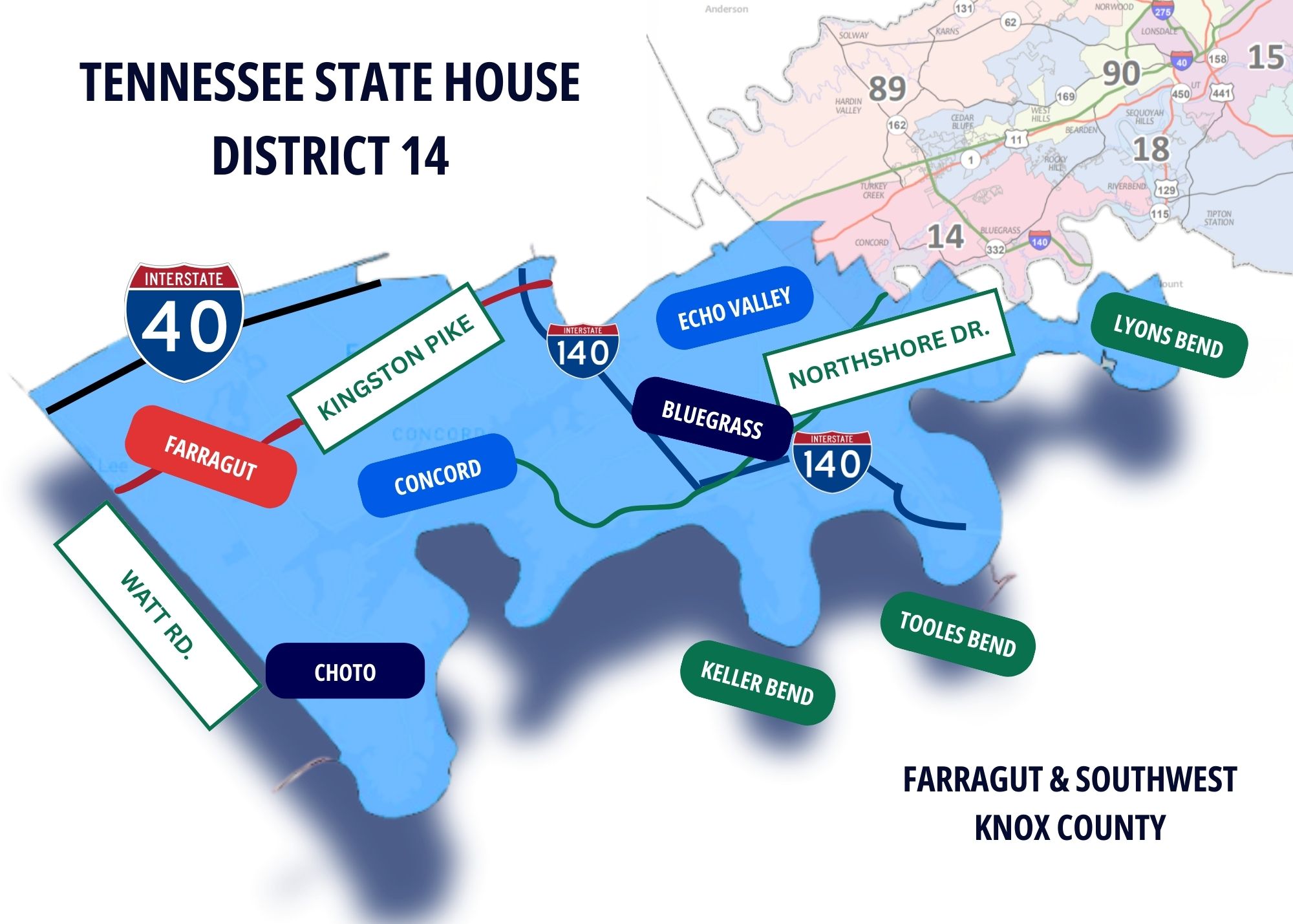 House District 14 is where I was born and raised. It includes Farragut and southwest Knox County. South of the interstate from Watt Road to Choto and all the way down to Lyon's Bend.